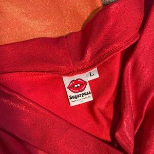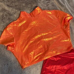 Dazzling orange top with a shimmering finish. Perfect for Halloween- pole dance- other??? Make this your own! Fabric has some stretch. Only worn once. Purchased from Etsy seller.