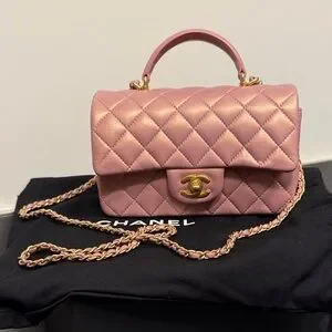 Stunning and highly coveted Chanel 21P Iridescent Rose Gold Mini Top Handle in buttery soft lambskin leather. This shade is one of Chanel’s most beautiful iridescent pinks — a luminous rose with gold pearl shift that changes in different lighting. A true collector’s piece. 🩷