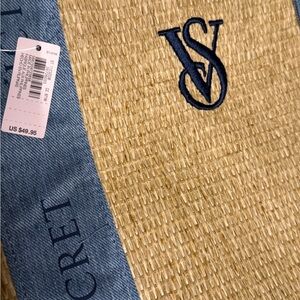 Elegant tote with a beige woven body. Features denim blue straps with logo detail. Ideal for daily essentials.