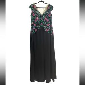 Chic black dress with intricate multicolor embroidery. Ideal for special events. New with Tags size 20Q in this brand it is like 20W or 2XL please go by measurements if you are not familiar with the brand