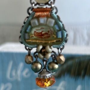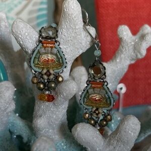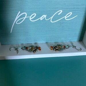 Gorgeous beaded drop earrings from Sundance that articulate and catch the light revealing the many colored beads. Orange, blue, gold . I don’t see a 925 but there is a makers mark on the back. Hinged hooks.
