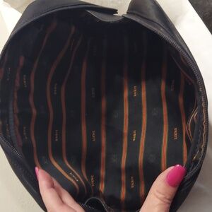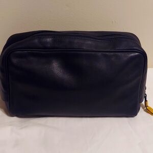 Beautiful large Black leather Loewe Clutch or cosmetic bag. Zipper top, gold hardware. Open interior lined in fabric. Very good condition. Light wear and fading to body and edges. Slight cracking to one corner. Clean Interior. No pockets.
