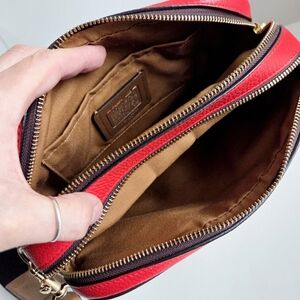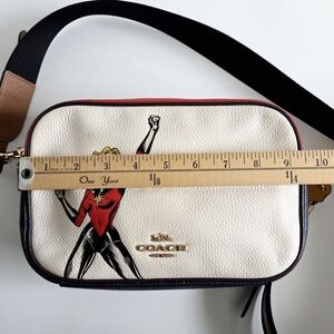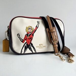 Coach × Marvel Jes crossbody bag. Removable striped nylon strap is adjustable at both ends, brown leather patches/straps. Cream bag, navy blue bottom, red top, gold hardware. Yellow hang tag. Measurements in photos, handle drop shown max length. This bag is so cool and unique, a collectors find. In excellent condition with no flaws.