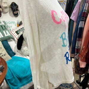 The perfect beach-day layer! Lilly Pulitzer lightweight open-weave sweater featuring the fun, signature phrase “Coffee Beach Repeat” in bright pink, aqua, and cobalt blue lettering. Soft, breathable knit ideal for coastal vacations, pool days, or cool summer nights.