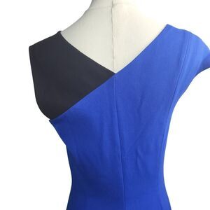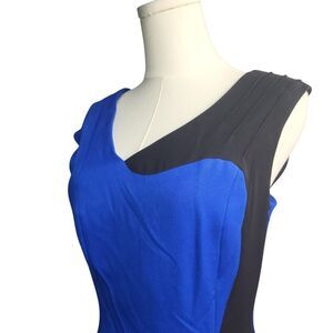 A body-con style dress with an asymmetrical neckline, featuring a blue front panel and black side and back panels. The dress is made from a blend of 70% polyester, 26% wool, and 4% spandex. It is designed to be form-fitting and knee-length, making it suitable for various occasions. *This dress is new not used, cleaned or pressed and may have wrinkles or creases which need to be pressed when received.