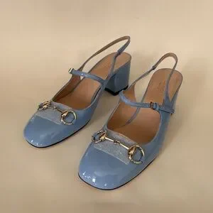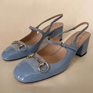 GUCCI Women's Horsebit Mary Jane Slingback Pumps Blue Patent Leather