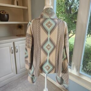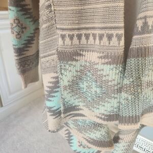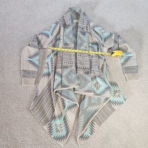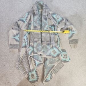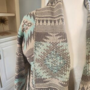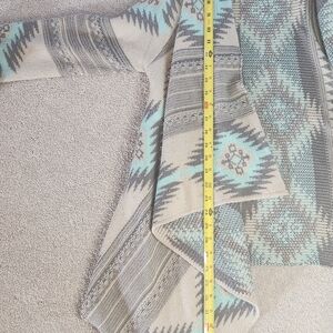 Stylish, cascading cardigan with geometric patterns. Features shades of grey, taupe and turquoise.