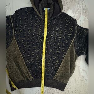 Beautiful textured leopard print cardigan, full zip with side pockets. Hooded for added warmth and comfort. Dark chocolate brown with black & gold thread. This has such a fun early 90s feel. In excellent pre loved condition with no flaws or stains. Recently dry cleaned and packaged & ready to wear upon receipt. No piling.