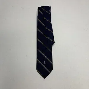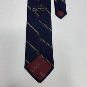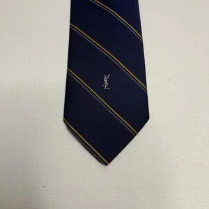 A refined Yves Saint Laurent tie in deep navy with sleek gold diagonal stripes, finished with the subtle YSL logo near the tip. A timeless, elegant piece that instantly sharpens any suit—perfect for work, events, or anyone building a polished designer wardrobe.