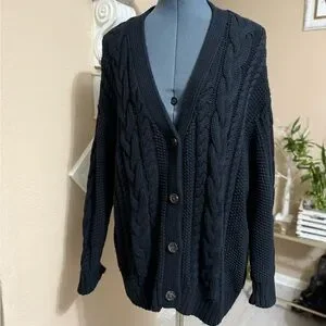 Elegant black cable knit cardigan. Features button closure. Perfect for layering.
