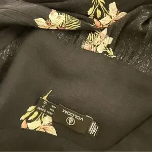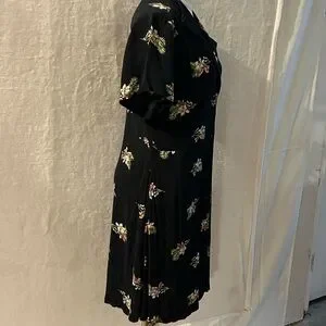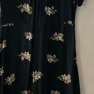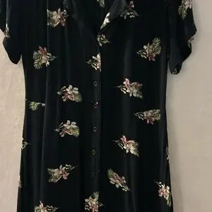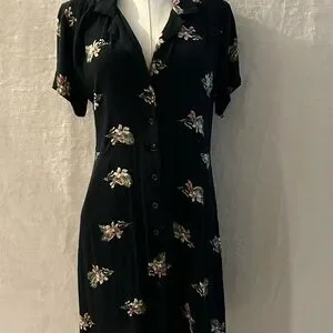 Stylish black mini dress with floral pattern. Features button-up front and short sleeves.