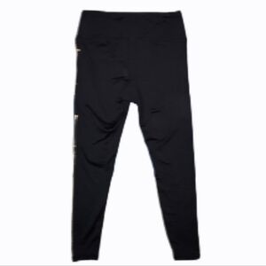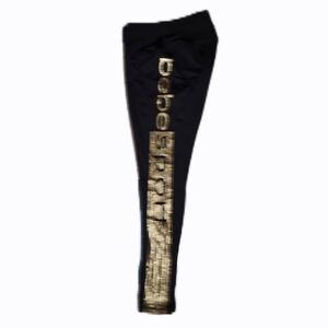 women's pants / black leggings with metallic gold "BEBE" logo and stripes down pants leg / form fitting tights / size Medium / women's activewear / flawless like new condition