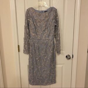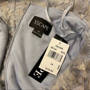 In Grey Gold. New with tag. A pretty look that's instantly elegant for celebrations and parties, this XSCAPE bodycon midi dress features sheer sleeves and beautiful allover lace.