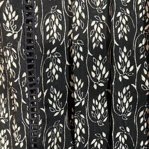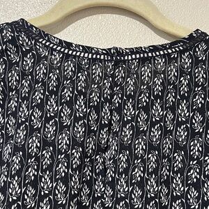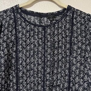 This elegant women's blouse features a stylish navy blue and white floral pattern, perfect for any occasion. The design offers a sophisticated look that pairs well with both casual and formal outfits. Has eye hook back closure and 3/4 puff sleeves. Size small petite.