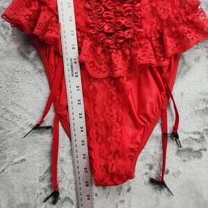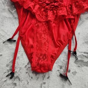 Vintage 80s Teddy Womens L Red Satin Ribbon Lace Ruffled Teddy Bodysuit Garters