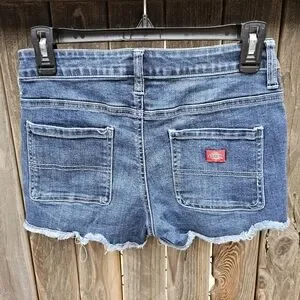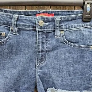 Stylish denim blue women's shorts with a frayed hem for a casual look. Perfect for summer outings.