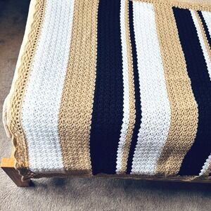 Beautiful handmade crochet afghan in a modern striped palette of tan, black, and white. Measures approximately 52" x 44". Soft, warm, and perfect as a lap throw, couch decor, or thoughtful handmade gift. New and never used. Clean, smoke-free home.