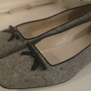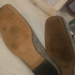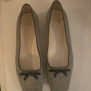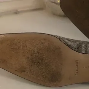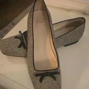 Chic COACH loafers with a stylish bow accent. Black trim complements the cream fabric. Ideal for versatile wear.