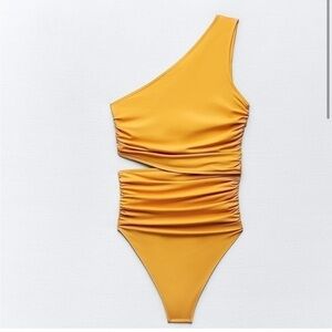 Nwt S ZARA sleeveless bodysuit with asymmetric neckline. Side cut out detail and ruched fabric. Bottom snap button closure