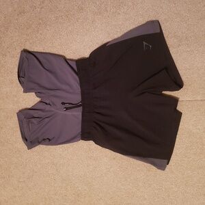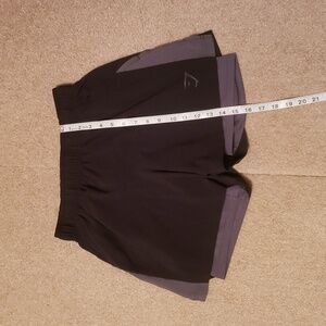 Preowned Gymshark Men's 2 in 1 Running Shorts. Size small. Has attached shorts and 2 front pockets. The front pocket has areas of discoloration.