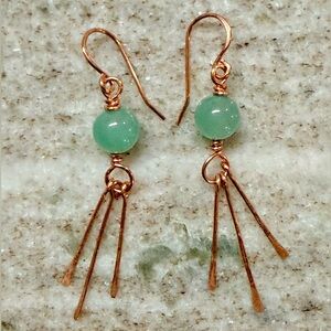 Green Aventurine Copper Dangle Earrings With Hammered Fringes