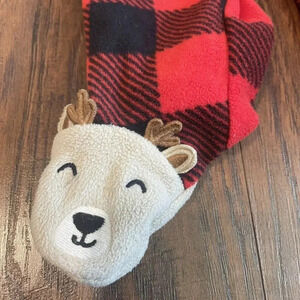 Stay warm and in the Christmas spirit with these pajamas. One is fleece buffalo plaid with reindeer details and the other is striped with the only and only Santa - both are footed. Neither have anti slip material. Both zip up for easy changing. These are a must this holiday season. No stains or holes!