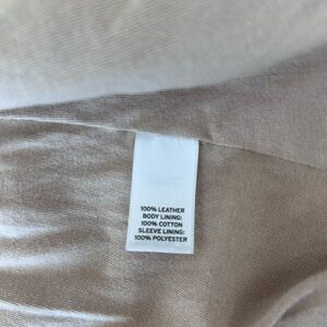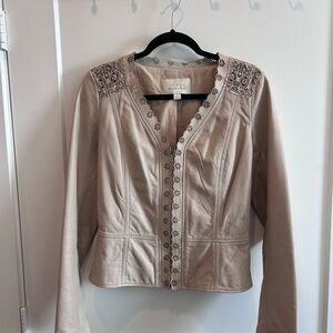 This is a Hinge women's beige leather jacket, perfect for adding a touch of boho chic to any outfit. The jacket features long sleeves, a zip-up front, and unique floral cutout accents along the shoulders and neckline. It's fully lined and made from genuine leather in a neutral tan/beige color. This stylish jacket is a size small and in excellent pre-owned condition, ideal for Poshmark shoppers looking for a trendy, high-quality piece.