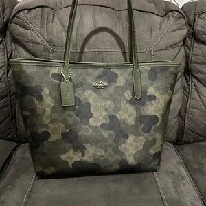 Elegant Coach tote with green and black camouflage pattern. Features sturdy handles and signature logo charm.