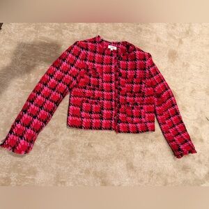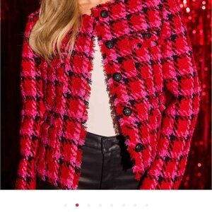 Elevate your style with this chic pink and black checkered blazer. Perfect for adding a bold touch to any ensemble.
