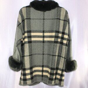 Brand new Northern Angel faux fur trim plaid coat in a timeless gray, black, and ivory check pattern. This elegant wrap-style jacket features ultra-soft black faux fur at the shawl collar and cuffs, creating a luxury winter look without the weight of a heavy coat. Designed with an open front and belt-style clasp closure for a flattering silhouette. Perfect for dressy occasions, holidays, or elevated everyday wear. Smoke-free, pet-free environment.