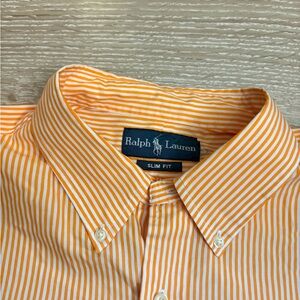 Elevate your wardrobe with this Polo by Ralph Lauren orange striped men's shirt. Perfect for any occasion, this shirt combines style and comfort effortlessly. Men’s size M-L Approx measurements in pics Good condition