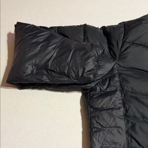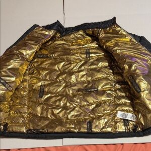 Stylish black jacket featuring a shimmering gold interior. Perfect for a bold look.