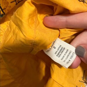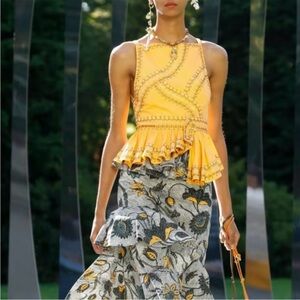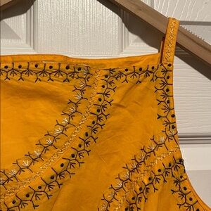 Features: embroidery, sculptural, boho, defined waist, peplum tank top, cotton, natural fibers, handkerchief hem, marigold yellow