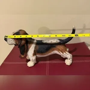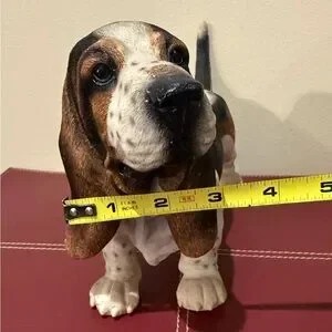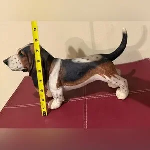 Charming Basset Hound figurine with realistic details. Features a mix of brown, black, and white colors.