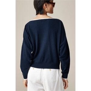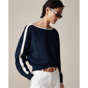 Everything's better in cashmere. Like this subtly nautical sweater, designed with dolman sleeves that taper toward the wrist, contrast stripe details that stand out, and a wider neckline. Write me with any questions!