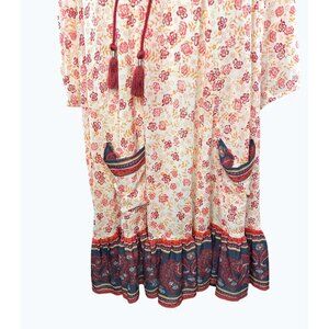 This charming tunic dress captures the essence of bohemian artistry, blending delicate floral patterns with paisley accents. Designed with a relaxed fit, it's adorned with tassels and functional pockets for an added touch of casual elegance. The lightweight polyester fabric ensures a comfortable wear, making it a versatile piece for various settings.