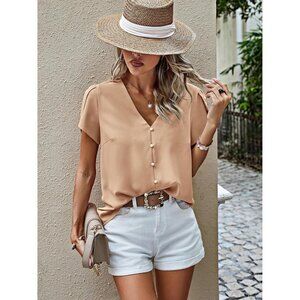 Features: Light and flowy chiffon blouse with a charming V-neck and chic pearl button details. The cap sleeves add a trendy touch, making it perfect for both casual and office looks. Not see-through, breathable, and super comfortable.