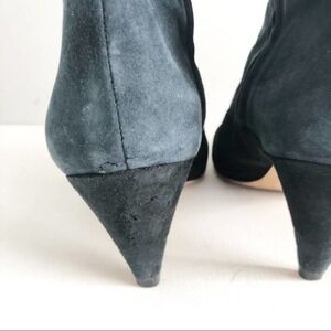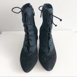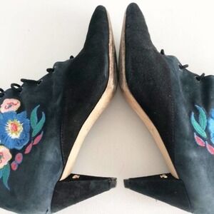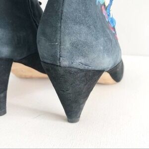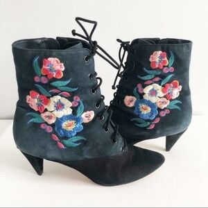 Features: black and blue suede, floral embroidery, lace up, heeled booties,