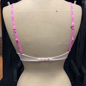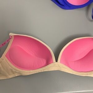 Size 32 D. Beige bra with pink shoulder straps. Push up padding with no wire. Good condition.