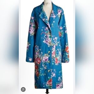 Sundance Royal Botanical Topper Linen Blend Blue Floral Trench Coat Size XL