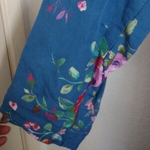 Very good condition, Stylish blue long coat with vibrant floral patterns. Perfect for adding a pop of color to any outfit. Linen/Cotton, featuring large pockets on each side.