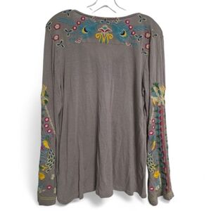 Elegant gray long sleeve with vibrant embroidered design. Features intricate patterns and lively colors. Pre-loved and in good condition. See photos for condition. Boutique brand.