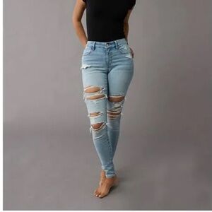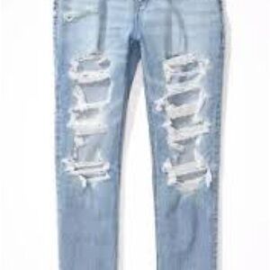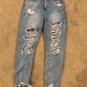 Stylish light blue jeans with distressed details. Straight leg design. Perfect for everyday wear.
