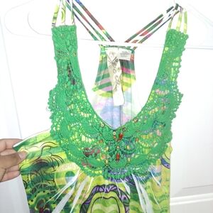 Eye-catching tank top with intricate green lace. Features a lively multicolor pattern. Perfect for a bold fashion statement.