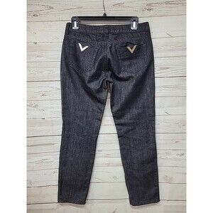 RED Valentino black Straight leg jeans in size 27. 6 inch zippers at inside of Ankles. Low Rise, 100% cotton and made in Tunisia. Rhinestone encrusted metal "V" shapes at each back pocket.
