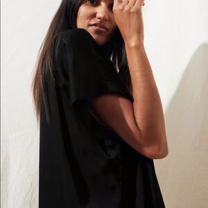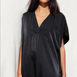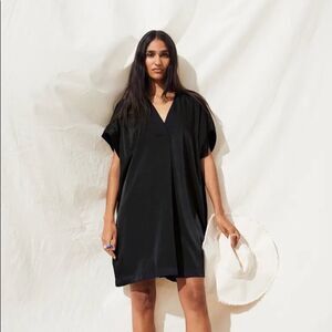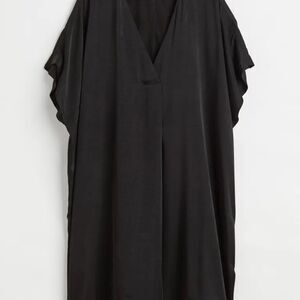 Knee-length dress in woven fabric with a slight sheen. V-neck, pleat at front for a draped effect, and short sleeves. Unlined.