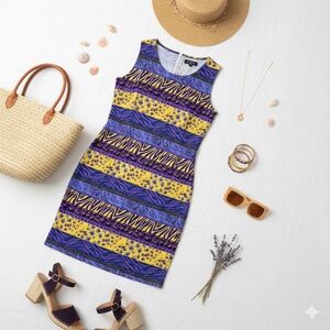 Make a statement with this vintage Y2K shift dress by Sag Harbor Woman. Featuring a bold mix of zebra and leopard prints in vibrant purple and yellow, this dress is perfect for dopamine dressing!