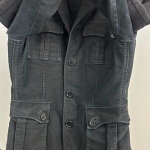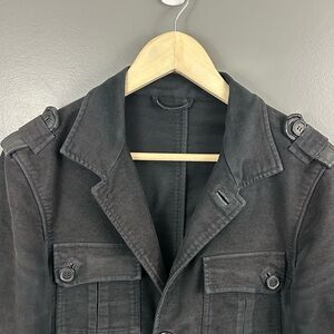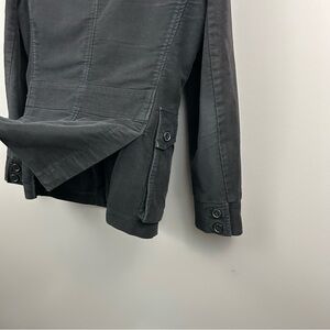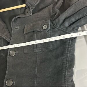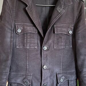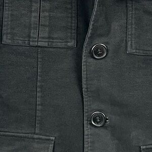 Selected Antique Moleskin Blazer Jacket in good pre loved condition with minimal signs of wear from normal use, is missing a button on the top right shoulder thick material keeps it tucked in on its own, could replace with top button from front or any other black button or leave as is. Great jacket with so many details. Front chest pockets, larger front bottom pockets, inside small pockets on both sides, back slots for comfort when sitting. Last picture shows jacket in natural light. Natural distressing gives this jacket character and texture.