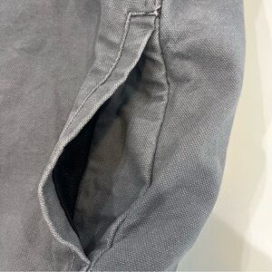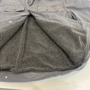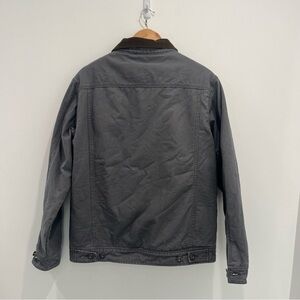 FEATURES/ACCENTS: Chocolate brown corduroy collar. Gray canvas jacket with chest and side pockets. Warm Sherpa lining. Perfect for keeping warm in the fall or winter.