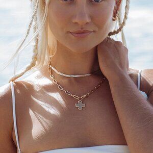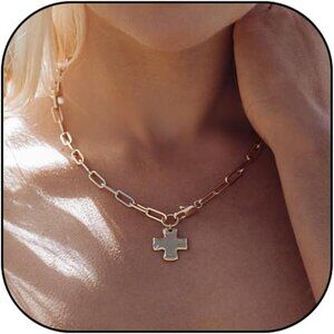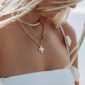 Features: A modern take on a classic symbol, this chunky brass cross hangs from a sleek paperclip chain. The gold plating adds a touch of shine, perfect for elevating simple outfits or stacking with other necklaces. Light and comfortable enough for all-day wear.